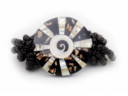 Náhrdelník s dominantním přívěskem z perleti. Přívěsek se skládá z malých perleťových úlomku a utváří krásný obrazec. Přívěsek je zavěšený na černé kůžičce. Náhrdelník se zapíná...